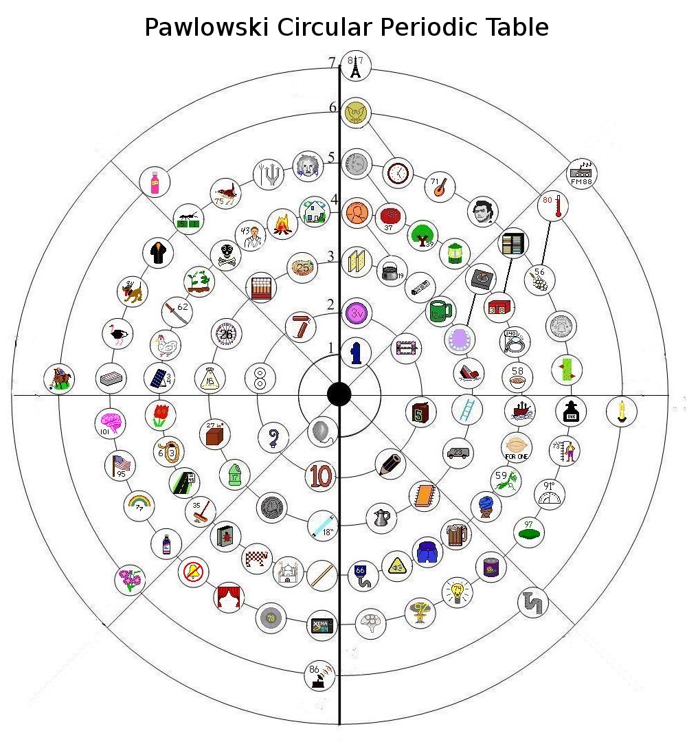 The arrangement of the elements in this chart is from Helen Pawlowski's model of the atom and her Circular Periodic Table, as described in her book The Visualization of the Atom (Riverton, UT: Pawlowski Family Trust, 1990). That book is reviewed in these pages. The icons are those created for my periodic table.