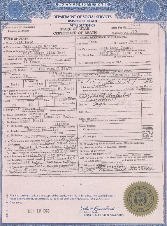 William Parker Pratt Death Certificate