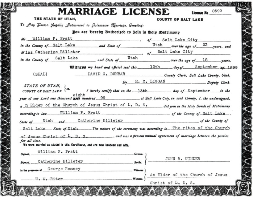 In 1898 I met William P. Pratt, a returned missionary who visited our ward. I'll never know why he should have paid any attention to little old me when I can name at least a dozen girls who would liked to have called him their beau. We only went steady about eight months and were married in the Salt Lake Temple Sept. 13, 1899. What a glorious happy day it was. I had the handsomest husband in the world. He was six years older than me and I looked up to him almost like he might be a king. We just automatically knew we belonged to each other.