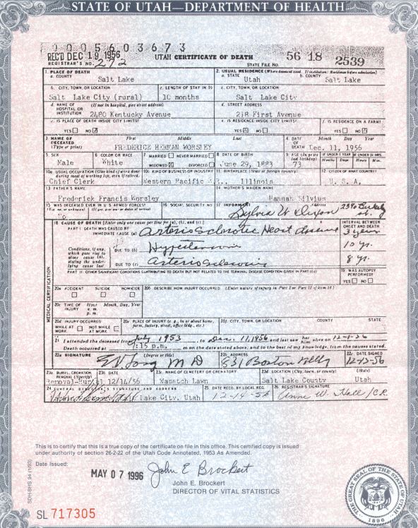 Fred H. Worsley Death Certificate