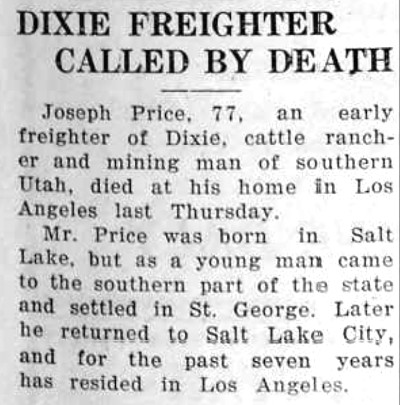 After only a few years, they left Oasis, and moved to California where in their later years they lived with their daughter Josie and her husband Claude Snow. Jode Price passed away in Los Angeles on 2 Jun 1932 at age 78.