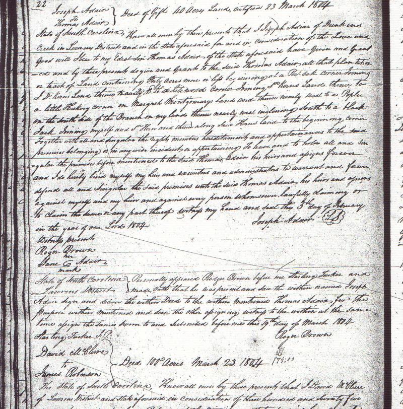 On the 23 Mar. 1804, he received a gift deed from his father Joseph Adair of 40 acres of land on Duncan Creek Laurens District, witnessed by Roger Brown and Jane Adair. This Roger was Rebecca's brother. Jane Adair was the daughter of Thomas Erskin Adair (Another family clue!). In this gift Joseph says, "In consideration for the love and good will I bear to my eldest son, Thomas Adair, etc.", giving the clue that Thomas is his eldest son.