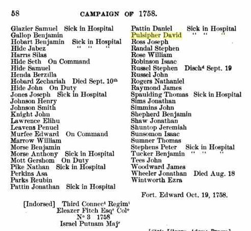 The resistance of the colonists to British oppression was building after that time. Soon after the Battle of Lexington, David at age 67 and his son John joined a band of patriots from there and other towns. On Fri 21 Apr 1775 the began their journey to the scene of the conflict at Boston. They were assigned to Captain Marcy's company and took part in the defense of the rail fence in the Battle of Bunker Hill. The battle was about who would control the Boston harbor. One account said that the Pulsiphers were two of thirteen Americans fighting against hundreds of British. Although the Americans ultimately lost that battle, due to running out of ammunition, it changed the outlook on the war because the losses on the British side were far greater. It proved that untrained local volunteer militia could stand up very effectively against Britain's power trained army!