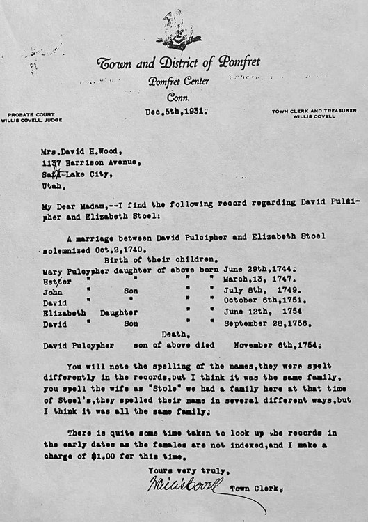 Wife: Elizabeth Stowell (1719-1786) 8 Children: Mary Pulsipher (1744-1827) Esther Pulsipher (1747-1842) John Pulsipher (1749-1827) David Pulsipher (1751-1754 Elizabeth Pulsipher (1754-1813) Samuel Pulsipher (1755- before 1766) David Pulsipher (1756-1835) Ebenezer Pulsipher (1759-1806) Father: David Pulsipher (1685-1775) Mother: Susannah Loude (1690-1786) ![]() ![]() ![]() |
