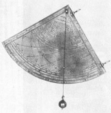 Pin one end of a thread to the center of the quadrant arc, and tie a small weight to the other. The thread must be long enough so that the weight is beyond the scale as in the illustration.