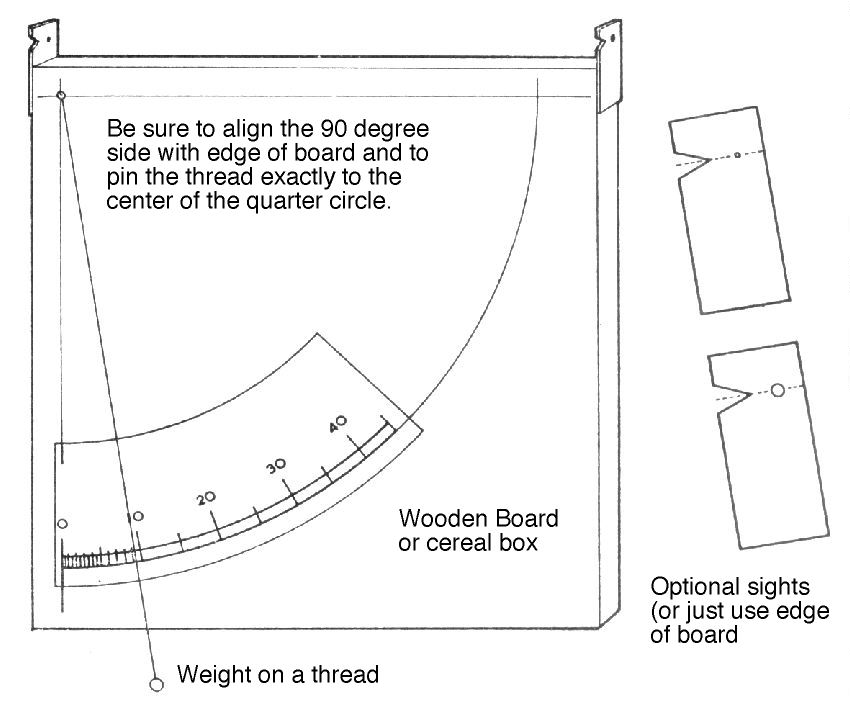 Glue or tape the quadrant scale onto a board (or cereal box). Be careful to position the 90° line of the scale to be exactly parallel to the longer edge of the board. As an option, you can add two sights as in the illustration, but it is okay just to sight along the edge of the board if it is straight.