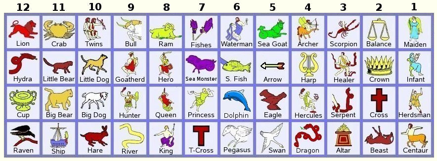 Column B contains my assigned constellation number followed by the abbreviation for the constellation name in Column C. The 48 constellations are numbered as four sets of 12. The first 12 are those of the zodiac beginning with Virgo and ending with Leo. The next three sets of twelve are numbered such that each dozen is aligned more or less at the same ecliptic longitude as are the zodiac constellations. Figure 1 shows a table of the order. They increase in number from right to left because they are shown at they appear in the sky. Look at the column on the left, Leo is number 12, Hydra number 24, Crater is 36 and Corvus is 48. The vertical ordering was done to maintain as much as possible the ancient Persian ordering of the three constellations which accompanied each of the zodiac constellations in their list of 48.