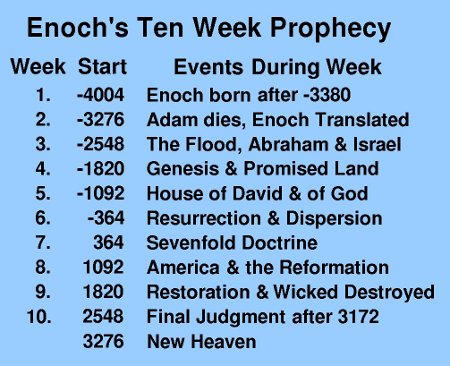 If we look a little deeper at the details, we see that Enoch includes the final Judgment Day within his Ten Week Prophecy. The Book of Revelation, however, clearly indicates that the final judgment occurs after the "little season" following the Millennium (seventh thousand year period) (Rev. 20:7,12). All of my work indicates that the little season is about 200 years, depending on the sacred calendar used. For example, on a calendar that divides history into twelve parts, the total history can be counted as 7,200 years, or twelve periods of 600 years each.