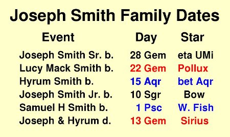 Let us now begin seeing the witness of the Star Calendar by considering its testimony of the Prophet Joseph Smith. That is the most powerful for two reasons. First, much more is known about his life and that of his family. Second, the precise dates are known from history rather than from calculations about the ancient past. As explained above, stars are assigned to days of the year according to their sidereal longitudes. To avoid unnecessary detail, those longitudes are not all presented in this article. They can be found in my published star tables.[5]