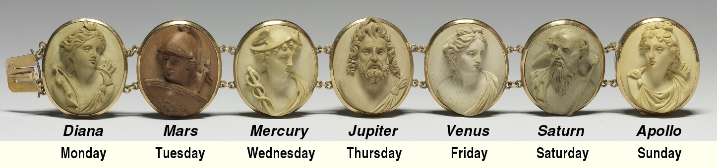 A brief discussion of the names of the days of the week may be worthwhile. In most countries, the names of the weekdays come from the names of the seven visible "planets" known to the ancients: the sun, moon, and five visible planets of Mercury, Venus, Mars, Jupiter and Saturn. In English, some of the names are similar to English: Sunday (Sun day) and Monday (Moon day) and Saturday (Saturn day). The others are from the Norse names of the gods/planets: Tuesday (Mars, Tyr's day), Wednesday (Mercury, Wodan's day), Thursday (Jupiter, Thor's Day and Friday (Frigg's Day).