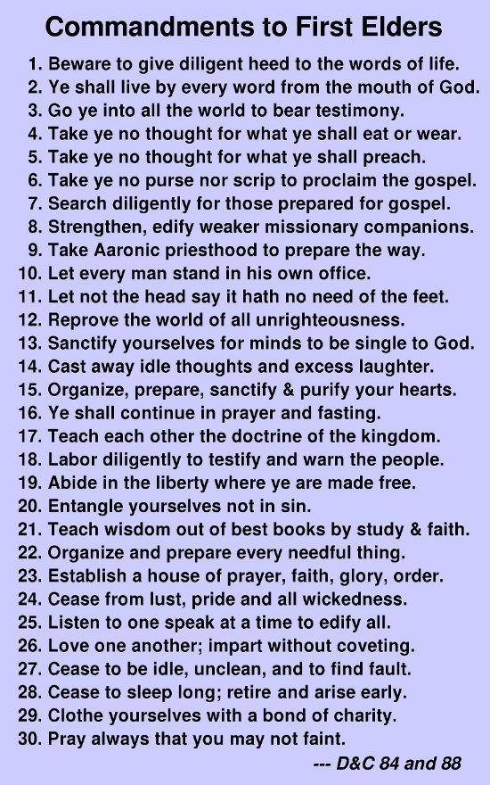 What can we do to prepare to build Zion? As we study the reasons that the Lord gave for driving the saints out of Missouri and Illinois, we see that the principal problem was that they did not actually keep the commandments He had given them. He noted that they were good at talking about the commandments, such as caring for the poor, but that they didn't actually practice them. Thus, let us first look at some lists of what commandments were given to different groups of people to at least understand what is expected of us. Then after we know the commandments, we can consider when it is right to alter them to fit special occasions or needs, especially when following promptings of the Holy Ghost.