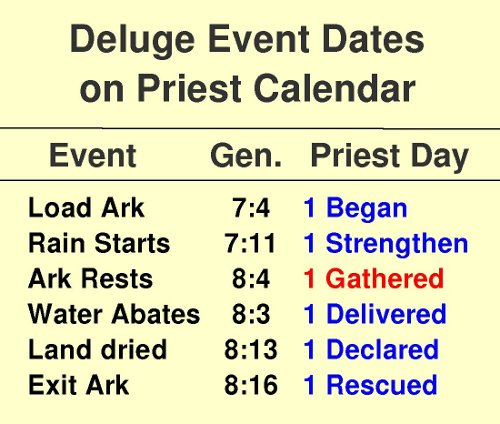 Precise dates were proposed in an earlier article back in 2004 for many of those events during the Deluge. That paper was about the Jubilee Calendar, attempting to show that many dates fit its pattern such as the day on which to "Begin Watering" and to "End Watering", etc. No thought was given in that article to the Priest Calendar.