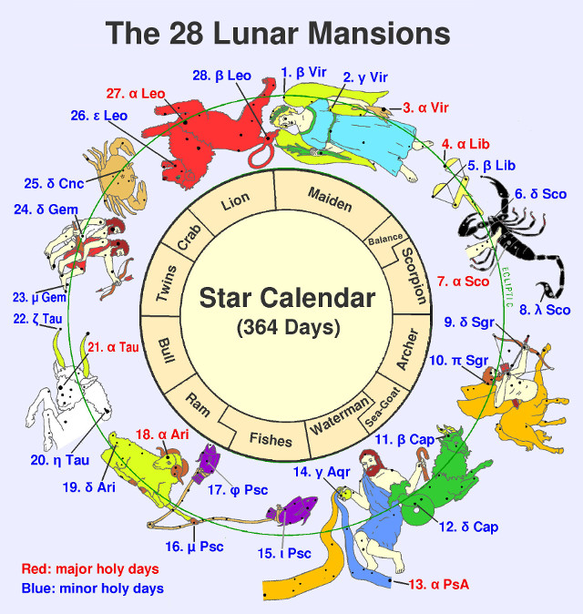 The apparent use of 28 lunar stations is to be a set of holy days on the Star Calendar[1] determined solely by star positions rather than merely set days of the year. It was noticed that many important sacred events occurred on star days that had been on the Babylonian and Arab lists. Thus, an attempt has been made to restore a correct list.