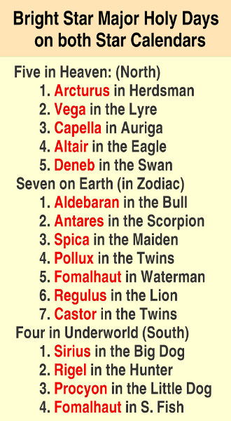 There are fifteen of the brightest stars which are major holy days on both star calendars. They fall on sixteen days because one of those stars is in two constellations and has one day for each. There are five bright stars in the "heavens", which refers to the area northward in the sky from the twelve zodiac constellations. There are seven on "earth", referring to the zodiac figures, and four more in the "underworld", south of the zodiac (see Table 2).