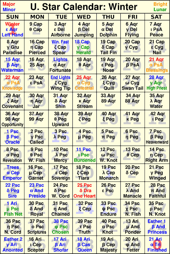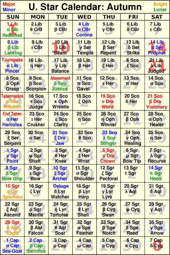 This article presents holy days based on the stars which apply to both versions of the Star Calendars. It also presents "seasonal" holy days, which correspond to the feast days on the Enoch and Hebrew calendars. They are only given in detail for the US Calendar because they are tied to the UE. That is, the US seasons do not precess through different zodiac months. On the other hand, the Star Calendar (S) does indeed track the actual positions of the heavens, including their slow precession through the seasons of 1° every 72 years.[4] Thus, its seasonal holy days actually change constellations. They will be covered in a future article.