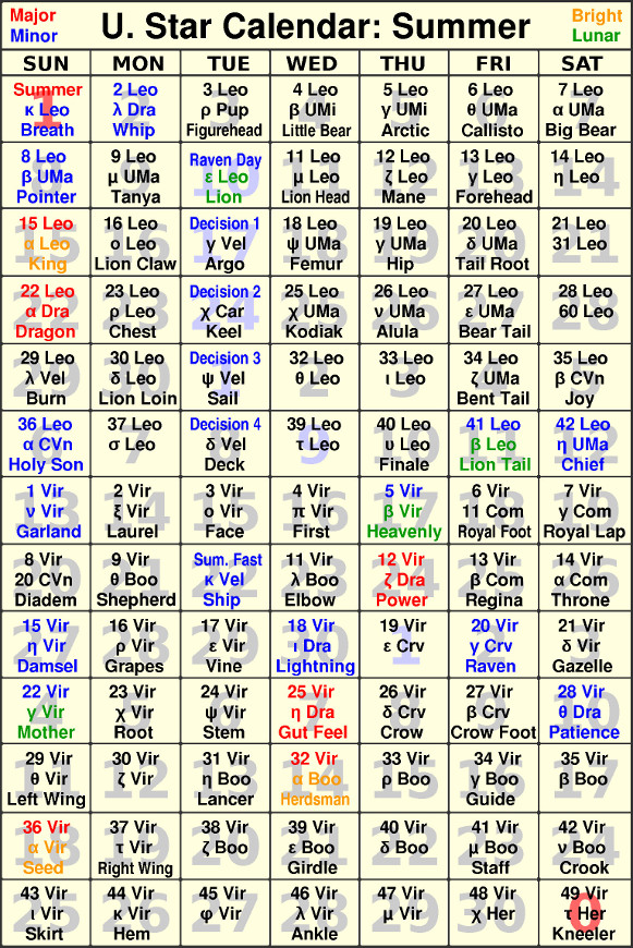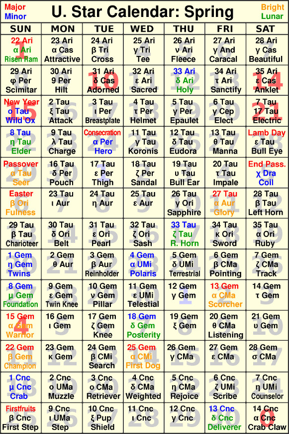 Major seasonal holy days have the day (first entry in box) printed in red, with minor holy days in blue. The star information (next two lines) is printed in orange for bright stars, red for Dragon stars, green for lunar mansions, blue for other minor holy day stars (including constellation reps), and black for other stars. The first of those entries on the middle line is the astronomical designation of the star, being a Greek letter with the abbreviation of the constellation, such a β Leo. The last entry in each box is the English name proposed in my work for the star.