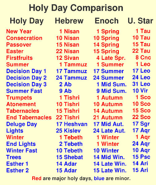 For example, both the Enoch and Hebrew Calendars have feast days such as Passover, Firstfruits, Trumpets, Tabernacles and the Festival of Lights. They fall on specified days of given months. For example, on the Hebrew Calendar, Passover falls on day 15 of the first month in spring and Tabernacles on day 15 of the seventh month in autumn.