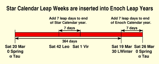 If nothing were done to adjust the Star Calendar, then the star α Tau would fall 364 days after the beginning of the graph, so its day would be Sat 19 Mar on the next year. Thus, to keep the equinox star date occurring on 0 Spring, it is necessary also to insert 7 days into the Star Calendar during that Enoch year. Those days must be added after the last day of the Star Calendar year, being 42 Leo. The illustration shows that week being inserted during the Enoch year (between June and October, slowing varying throughout history), which pushed the Star Calendar New Year Day (1 Vir) to be a week later. Accordingly, all of the star days thereafter are advanced one week, with the effect being that the star α Tau will occur on Sat 26 Mar and 0 Spring of the next Enoch year. Thus, the star α Tau remains the equinox star after both intercalations are completed.