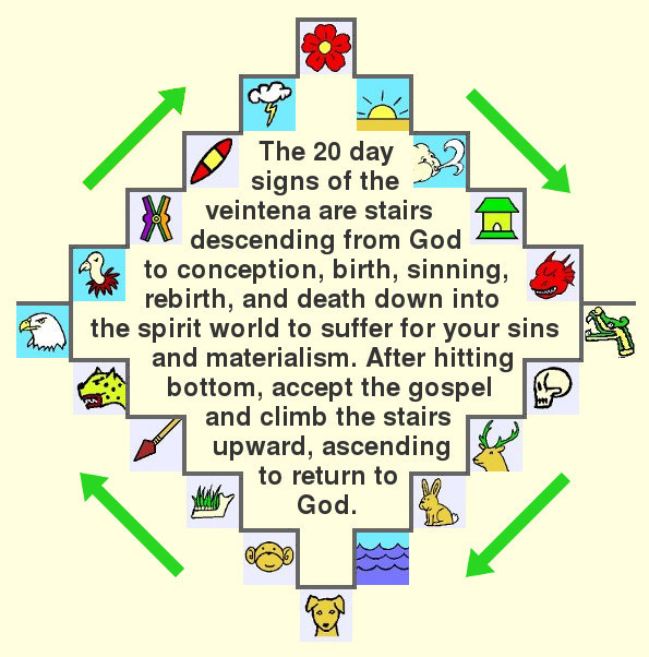 The Mayans taught that these twenty steps in life are the rungs of two ladders, one with ten rungs coming down from heaven to hell and then ten more rungs on a ladder leading back up to heaven. It was noticed that this concept is very similar to the dream that Jacob had of angels descending and ascending on a ladder to heaven. Thus, the new perspective that all of the day signs of the veintena represented rungs on two ladders was considered. When charts were made with the day sign names and meanings, Enoch and Hebrew holy days, and corresponding Star Calendar lunar mansion holy days all shown together for each step, new interpretations of some day signs were achieved.