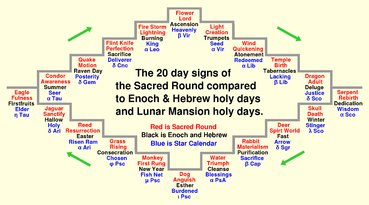 In the course of writing that article it suddenly became clear that the same phenomenon had repeated with the Star Calendars of holy days aligning with the 20 days of the veintena cycle. That is, 20 of the 28 lunar mansion stars also had the same symbolism as the veintena day signs and holy days on the Hebrew and Enoch Calendars! What was becoming clear is that different calendars not only include these steps of life, but apparently all of the sacred calendars include these steps in the same order![6]