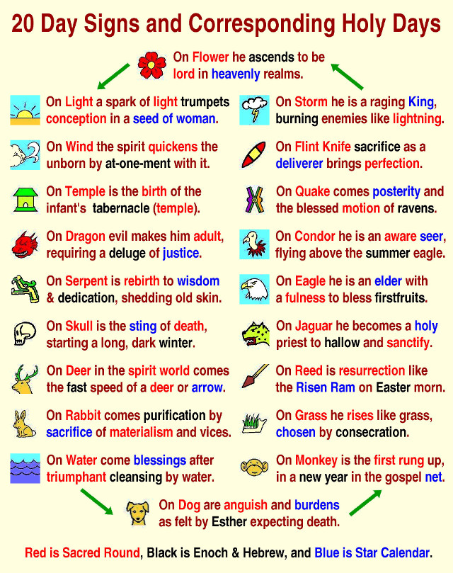 Given that these four sacred calendars all tell the same story of ladders down and up from heaven, one can combine their symbolism (see Figure 4) to get an increased understanding of the meaning of each step. The rest of this section is a detailed look at each of the twenty day signs compared to the corresponding holy days on the Hebrew, Enoch, and Star Calendars.