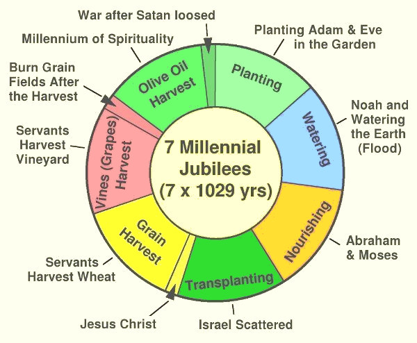 Although that scripture may have many meanings, one has been suggested in an earlier article. The Jubilee Calendar divides the year into seven parts with three week-long feasts. They are clearly named to suggest a correlation of the seven millennia of the family of Adam of earth. That is, the Watering represents the Deluge and there is a Burning just before the last Millennium of spirituality (olive oil). Thus, for this calendar, all of the days, weeks, and seasons of the Jubilee Calendar can be seen to use the very same yearly pattern to represent all of our history: "one year with God".