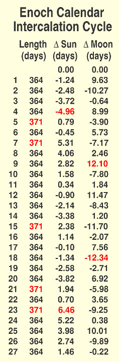 The difference between the sidereal year and the seasonal (tropical) year is very little. The tropical year averages 365.2424 days and the sidereal year is 365.25636 days. That means that the stars shift by 1° every 72 years through the seasons. This small difference means that the 27-year intercalation cycle of the Enoch Calendar (Table 1) can also be used for the sidereal year. In fact, it works even better for the Star Calendar because after one 27-year cycle, the discrepancy is only 1.08 days for the stars instead of 1.46 days for the sun. Of course the discrepancy for the moon is the same for both.