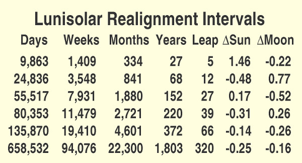 Table 2 shows the results of calculating "realignment intervals" after which the three periods of the week (7 days), lunar month (29.53059 days), and solar year (365.2423 days) all realign again better than any other shorter period.[4] They are used by simply counting around the 27-year cycle to get to 68 years and then stopping and starting over at the beginning of the table. Table 2 shows in the "Leap" column that those 68 years require 12 leap years. That means going twice through the table (54 years) gives 10 leap years, so finishing with the first 14 years in the table means those 14 must contain exactly 2 leap years. That is true so that method works. Repeating that process by counting two 68-year cycles plus 16 more to get 152 years means that the first 16 years of the table must have 3 leap years. That is also true, so that works! This method is continued up to 1,803 years. That last period of 1,803 years is important enough in sacred calendars that it was been given the name "saros century" because it is exactly 100 saros eclipse cycle periods of 18.03 years.[5]