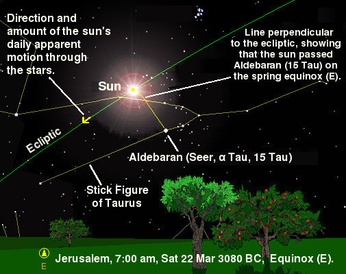 The stars are slowly shifting by 1° every 72 years, which is the length of the arrow showing the daily motion of the sun. The slow motion of the starry background is in the same direction as the the sun is moving. What is not shown in Figure 2 is that this was one of the first times that the star day 15 Tau (Aldebaran) had moved parallel to the ecliptic far enough to the left in the illustration to actually have arrived at that position by the time of the spring equinox on the Enoch Calendar. After the illustration was made for 3080 BC, it was discovered that the same also occurred on Sat 22 Mar 3091 BC, so that may be the date of the beginning of the Feast Age of Taurus. The date of the opening year of the Feast Age of Taurus would be the first date on which that occurred. The beginning date depends on the precise intercalation methods of both the Enoch and Star Calendars. Neither is perfectly known, so the beginning date is subject to change slightly. As stated so many times, this is a work in progress!
