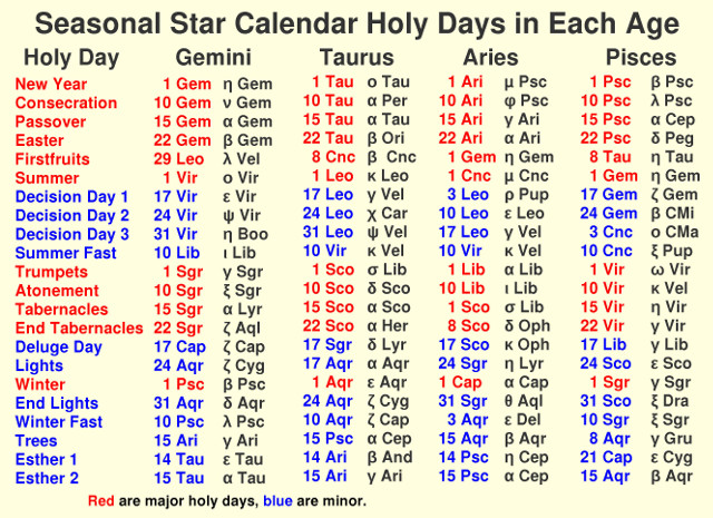 At the beginning of each of these ages, all of the seasonal holy days change to new star days as proposed in Table 2. The days for the Feast Age of Taurus are identical to the permanent feast days of the Uniform Star Calendar published earlier.[9] In other words, the "Taurus" column in Table 2 matches the "U. Star" column in Table 1. In both tables the usual major holy days are shown in red and minor holy days in blue. All of the stars are shown in black for simplicity, but some of those star days are always major holy days, such as the brightest stars. In those cases, holy days which would have been minor according to Table 2 are celebrated as major holy days. In other words, star days may be raised to a more holy status when they are seasonal holy days, but they cannot be lowered.