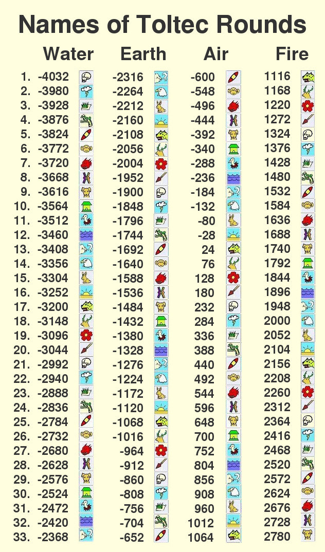1. The Toltec Calendar 1.1 365-Day Years 1.2 52-Year Rounds 1.3 1,716-Year Ages 2. Sacred Event Dates 2.1 Age of Water (4033-2318 BC) 2.2 Age of Earth (2317-602 BC) 2.3 Age of Wind (601 BC-1115) 2.4 Age of Fire (1116-2831) 3. Conclusion Notes |
