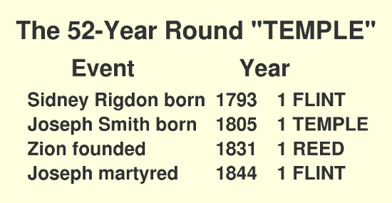 The 52-year round which began in the year of Sidney's birth would encompass the entire restoration of the Church of Christ, up through the death of of the martyrs Joseph and Hyrum Smith. The name of this round was TEMPLE, symbolizing birth. That era was truly the birth of the restoration of the fulness of the Gospel in thise latter days.