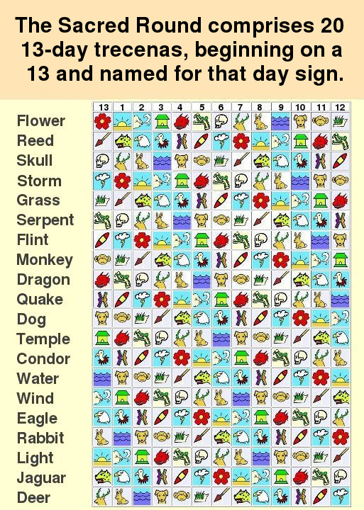 There is another reason why the years are not named after the first day of each year of the round, but instead keep following the 1 FLINT, 2 REED, etc., pattern for each round. It is because the entire round, not just the year, is named for its beginning day! To understand how this works it is important to understand more about trecenas because every year begins with a trecena, which in turn is because only trecenas are intercalated.