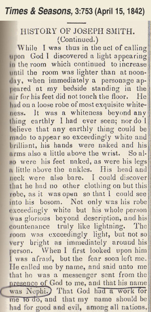It would make perfect sense for the angel to identify himself as Nephi at first because the record begins talking about Nephi. It is here proposed that what the angel actually said on that first visit was that his name was Nephi. Then after the book was finished being translated and the plates were returned to the angel assigned to keep them, Joseph might well have learned about multiple probations and that the angel had also lived as the prophet Moroni. It would then be known that the reason that the angel had charge of the plates was that he had been Moroni, who had buried them. Thus, when Joseph later referred to the custodian of the plates, he used the name Moroni, which made much more logical sense, given the entire history of the Plates of Mormon.