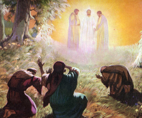 And after six days Jesus taketh Peter, James, and John his brother, and bringeth them up into an high mountain apart, And was transfigured before them: and his face did shine as the sun, and his raiment was white as the light. And, behold, there appeared unto them Moses and Elijah talking with him....