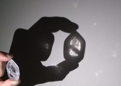 Mauricio also had the interpreter stones. He held one near the wall, while shining light through it from his phone flashlight to display several spots of light. I took the photo of those six spots, visible in Figure 5, which includes Mauricio's hand and the shadow of his phone. In his Preface to The Sealed Book, he describes how when he looked through both of the interpreter stones that various possible translations words would appear at those places from which he chose what felt like the best word.