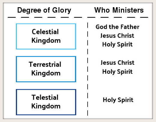 The Church of Christ as restored to Joseph Smith was given to know that actually "heaven" has three degrees or levels: telestial (least glory), terrestrial (middle), and celestial (most glory). A simple way to think of the three levels is that the celestial are those who accepted Jesus and chose to follow God's commandments valiantly during life, the terrestrial includes those who rejected Jesus in life, but accepted Him afterwards, and the telestial is for those who totally rejected God and Jesus, but at least followed their conscience and promptings of the Holy Spirit. Those who rejected even the Holy Ghost are the only ones who do not go to some level of heaven, but instead are cast into the lake of fire prepared for the devil and his angels. They are called the sons of Perdition. Everyone will go to the place where they will be happiest (D&C 88:33) because it is uncomfortable to associate with those either above you or below you in spirituality. Let's review that revelation, because the requirements for each differ substantially.
