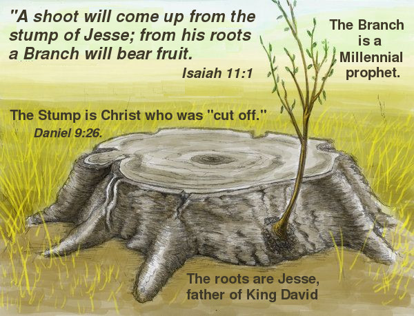 Now we are equipped to attempt to better understand a puzzling prophecy about a powerful millennial prophet. Isaiah prophesied that a shoot would grow out of the stump of Jesse (see Figure 7). That translation from the New International Version[5] is better than the King James version which states that a "rod" shall come forth from the "stem" of Jesse (Isa. 11:1). It goes on to predict that he will have the spirit of wisdom, be a righteous judge, and with his lips he will slay the wicked. He will definitely be a millennial prophet because the wolf, lamb, leopard, kid, lion, and calf will all lie down together in peace (Isa. 11:6).