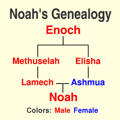 As part of the covenant that the Lord made with Enoch, it was promised that Noah would come from the fruit of his loins, which is another way of saying Noah would come from the seed of Enoch (Moses 8:2). Enoch's son Methuselah was also told the Savior would be his descendant, which caused him to brag that all of the kingdom's of the earth would descend from him (Moses 8:3). The reason that is interesting is that Methuselah married Ashmua,[3] the daughter of his brother Elisha. One might think that Elisha could also claim the same thing because Noah would also be his grandson (see Figure 4). But apparently the lineage of Noah's mother was not relevant to the promise that both Noah and the Savior would descend from Enoch. Thus, it appears that only the patrilineal ancestors were listed in the fulfilling of this promise, so Elisha was not included in that list.