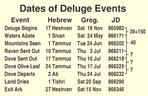 It is amazing that starting on 17 Heshvan, the day given when the rain began, then counting 40 days, then 150 days, then 40 more days, brings one precisely to the three sets of 7 days when Noah sent out birds, the dove being precisely on the three Decision Days on the Hebrew Calendar!