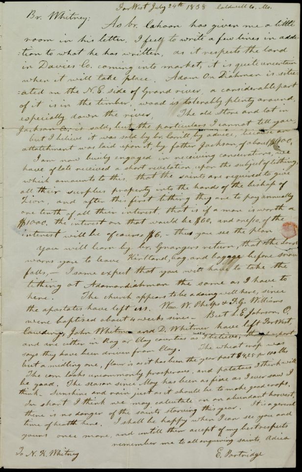 In 1838, when the revelation was given, what was the understanding of the meaning of the word "interest", on which the members of the Church should pay their annual tithing? Fortunately, that is now known precisely, because a letter has been found in the Joseph Smith papers from the Presiding Bishop Edward Partridge to Newell K. Whitney, which explained his understanding of the new revelation. The letter is dated 24 Jul 1838, shortly after the revelation was given earlier that month.