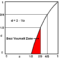 You can see that most of the good from making your offense shots comes in just raising the fraction of successes up to 2/3. The curve rises very steeply at first, so that if a player makes 2/3 of her attacking shots, the defender must return half of them to play even. So as my friend was able to increase his percentage from 50% up a little bit to 67% (that is, to 2/3), what surprised me was that I had to increase my returns from 0% all the way up to 50%, just to play even. That point, where the defender must return half of the attack shots seems like a good place to define as minimum fraction that an attacker must make. That is, if the defender doesn't even have to return half of your shots to keep playing even, then you are in the "Beating Yourself Zone," shown in red in the graph. On the other hand, if you can make at least two thirds of your "winners" that are good enough that half of them don't come back, then you have a good chance of winning. For those interested, the exact equation and the derivation are also given.[1]