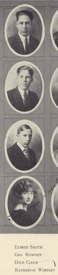 The photos at right are from one column on page 79 of Mother's 1924 LDS High School yearbook section for juniors. My mother, Kathryn Worsley Pratt, is at the bottom of the page. The fellow at the top of the column is Eldred G. Smith, a direct descendant of Hyrum Smith, who later became the Presiding Patriarch of the Church, which in the early days was the highest Church position (D&C 124:124). He presided over all of the patriarchs in the Church and gave patriarchal blessings in the Church Office Building to those from outside organized stakes who came to him. He always spoke in LDS General Conference until the position of Church Patriarch was eliminated in 1979, after which he continued to given blessings until he passed away at age 106 in 2013. I attended his funeral. Just below his picture is that of George W. Romney who became president of American Motors, then governor of Michigan, and was the Republican presidential candidate for the 1968 election. He was also the father of Mitt Romney who likewise became the Republican presidential candidate for 2012.