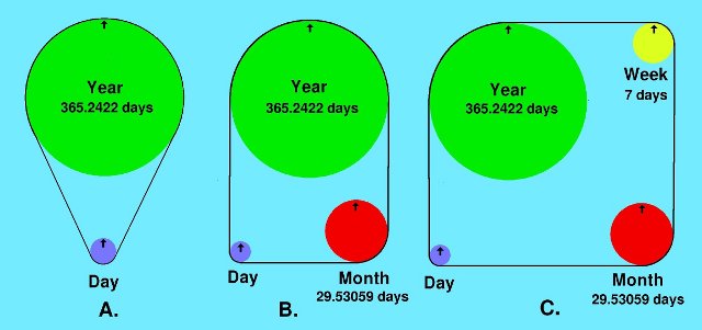 A calendar can be thought of as a clock that keeps track of longer periods or cycles of time the sun and moon are like the hands of the clock. Note that our word "watch" (meaning clock) is the same as that formerly used to describe a time period determined by "watching" the sky (as in Matt. 24:43). A problem that arises is that sometimes the cycles do not 'come out even. For instance, the solar year, in which the seasons repeat, equals 365.2422 days rather than a whole number of days such as 365. A question fundamental in the construction of any calendar is how to align the different cycles. The solution lies in finding an interval that is approximately a whole number of all the cycles.