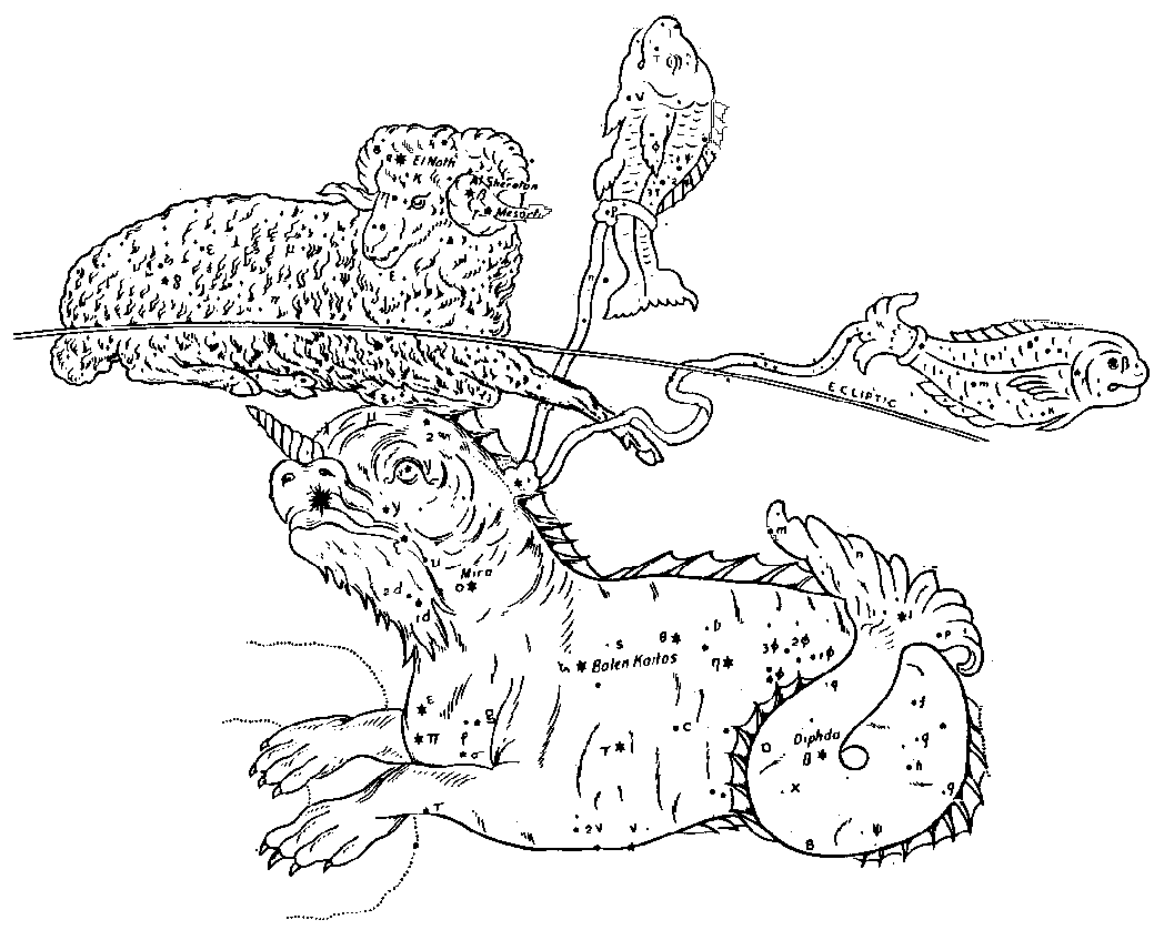This article focuses on just two of the twelve zodiac constellations. They are The Fishes (Pisces) at 7 o'clock and the Ram (Aries) at 8 o'clock. The two fish are tied by their tails with cords (bands) to a huge sea monster (Cetus). The Ram is the next constellation, and is sometimes drawn with his leg across the cords, as in the rendition in Figure 3 taken from the 1835 maps by Elijah Burritt. Most gospel interpreters agree on the obvious meaning: Christ is the Ram (Lamb of God) which breaks the bands of death which bind mankind to the sea monster (Cetus), who represents both Death and Hell.