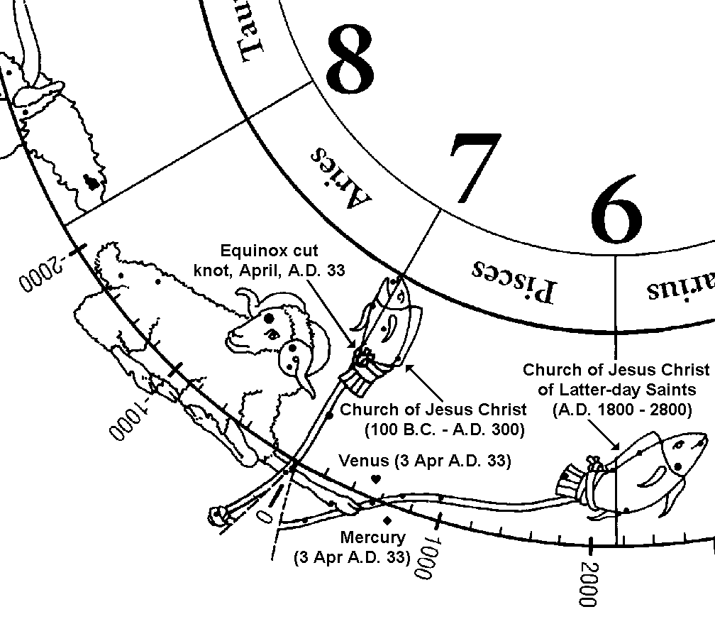 Now consider what the two fish represent. The first one spans the time on the ecliptic which corresponds to about 100 BC to AD 300. That fits very nicely with the Church of Jesus Christ, remembering both the Eastern and Western Hemisphere. The second fish begins very nearly at the year 1800 and extends well into the Millennium. Thus to me it seems most probable that the two fishes represent the early Church of Jesus Christ and the restored Church of Jesus Christ of Latter-day Saints.