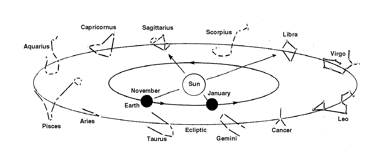 Twelve of the constellations form a band around the sky through which the sun, moon, and visible planets all appear to travel (see Figure 1). That circle of constellations is called the zodiac. The apparent path of the sun is called the ecliptic. The zodiac constellations can be thought of as the twelve numbers on a huge clock face in the sky. The observer is at the center of the circle. At any given time only about half of the twelve are visible because the other half are below the horizon. The planets act as hands which move clockwise around the clock face to tell time (see Figure 2).