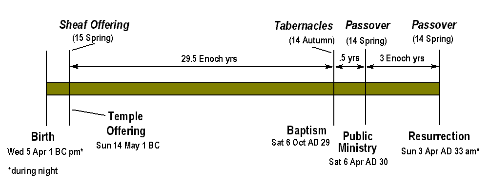 Now consider the key dates for the Savior on the Enoch Calendar. Because the Hebrew and Enoch calendars are perfectly aligned during the Savior's entire ministry, the day he began his public ministry was Passover on both the Hebrew and Enoch calendars. Similarly, the day of his resurrection was the Sheaf Offering on the Hebrew calendar, and either on Passover or Sheaf Offering on the Enoch calendar, depending on the time of the beginning of the Enoch day. The day of his baptism was on the day of Atonement on the Hebrew calendar (Sat 10 Tishri) and on the feast of Tabernacles on the Enoch calendar (Sat 14 Autumn).[22] So three of the four key dates in the Savior's life fell on holy days on both the Enoch and Hebrew Calendars.