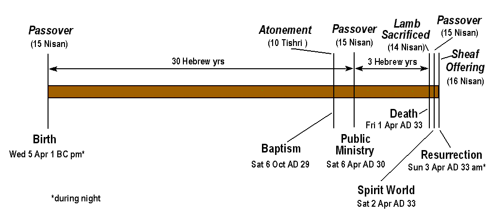 The proposed dates in the life of the Savior were calculated from the Judean calendar, which was the version of the Hebrew calendar used at that time in Jerusalem. It is now clear after the fact to Christians that many of the rites of the law of Moses were symbolic of the events in the life of Christ. For example, the Passover lamb symbolized Christ who would be sacrificed (John 1:29, 1 Cor. 5:7). It is important to note that the very time at which the Savior was being crucified on Fri 1 Apr AD 33, the Passover lambs were also being slaughtered according to the Judean calendar. On the next day, Passover, which celebrates the liberation of the captive Israelites from Egypt at the Exodus, Jesus Christ was in the spirit world preaching liberation to the captives there (1 Peter 3:18-20, Isa. 61:1). Similarly, there is the Sheaf Offering of the firstfruits from the ground that was made on Sun 3 Apr AD 33, shortly after the Redeemer was resurrected and became the firstfruits of them that slept (1 Cor 15:20). One correlation which has not been so obvious is that the feast of the Passover, that is, the joyous celebration, was really the Savior's birthday party, who would be liberated from the captivity of the womb and be born on the same day that the nation of Israel was born. Thus the timing of the various rites of the law of Moses all pointed to Christ as being the Messiah (Gal. 3:24).