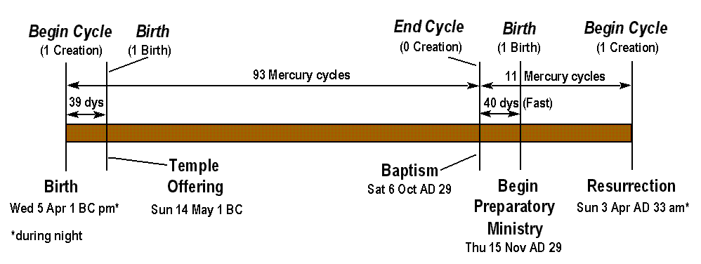 Mercury Calendar. The "birth" symbolism of the presentation at the temple finds a second witness in the Mercury calendar, which has been described elsewhere.[25] The "birth" of the planet Mercury occurs when it rises as an evening star, on the day "1 Birth" on the Mercury calendar. That day always occurs exactly 39 days after the day "1 Creation" on that calendar, which is the beginning of the Mercury cycle. The Savior was born on the day 1 Creation on the Mercury calendar. Sun 14 May 1 BC was the day 1 Birth on the Mercury calendar, a second witness to the birth symbolism of that day.[26]